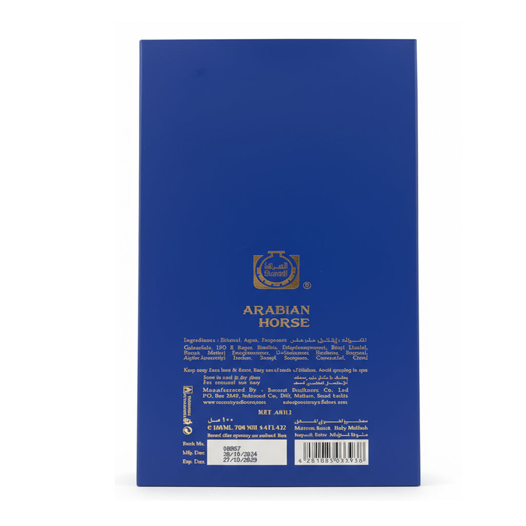 Introducing Surrati Arabian Horse Eau De Parfum. A captivating 100ml unisex fragrance that embodies grace and strength. This bold and invigorating EDP features a rich blend of woody and spicy notes, evoking the strength and majesty of the Arabian horse. The composition opens with the warmth of Musk and Amber, deepens with Leather and soft Powder in the heart, and settles into a lasting base of Patchouli and Spices. It is ideal for the adventurous spirit who exudes confidence and charm.