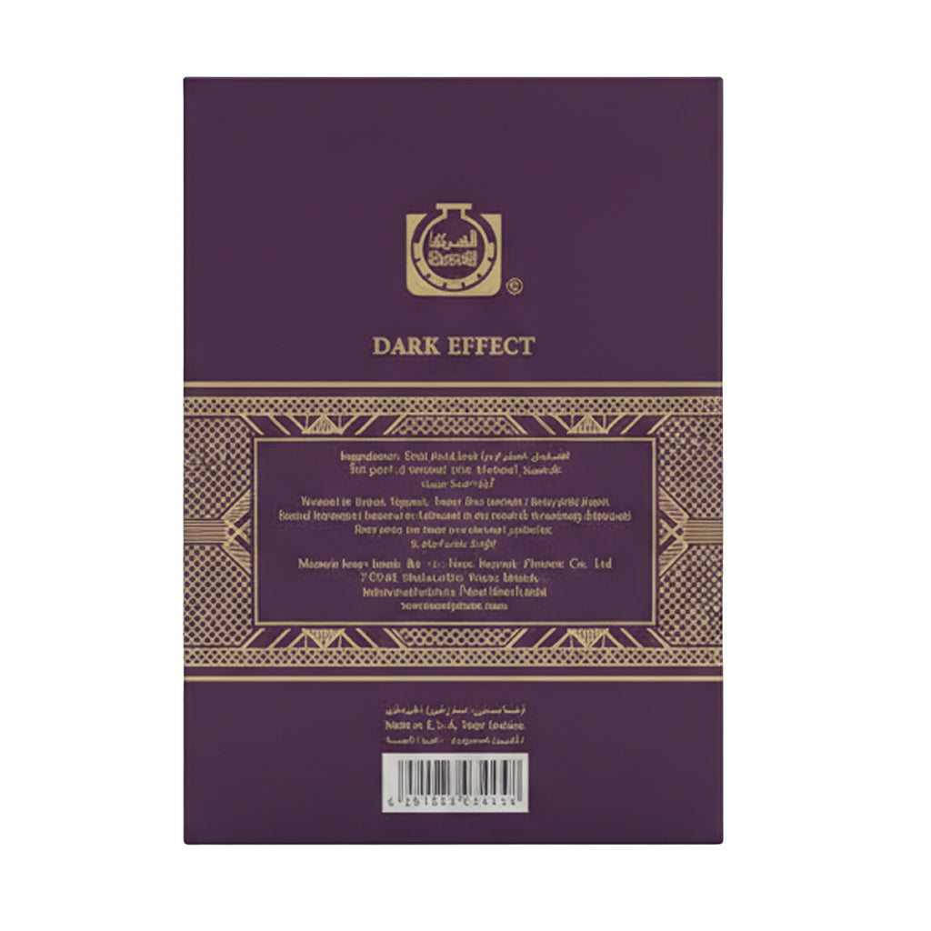 Introducing Surrati Dark Effect Extrait De Parfum. Abold and intense 100ml unisex fragrance that delivers a dark and mysterious aroma. This captivating Extrait De Parfum is crafted for those who seek depth and intensity in their signature scent. It features a unique, intense blend of sweet Caramel and spicy Nutmeg in the opening, a dark heart of Patchouli and Cashmere Wood, and a grounding base of Moss.