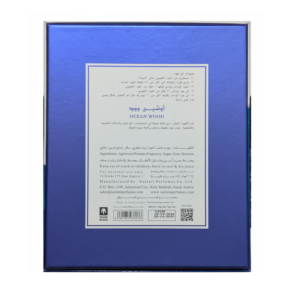 Introducing Our Ocean Wood Eoud Incense Sticks, a collection of 16 premium sticks that brings the refreshing breeze of the ocean into your home. Crafted from high-quality natural agarwood, this incense is blended with notes of citrus, sea salt, woody and mossy tones, capturing the essence of fresh air mixed with the richness of oud. The result is a cool, soothing, and long-lasting fragrance that effortlessly uplifts any environment.