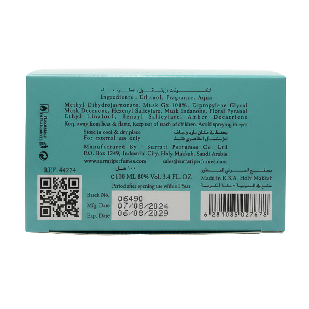 Surrati Turqoise Eau De Parfum 100ml: Versatile Warm Spicy, Marine & Vanilla Unisex Fragrance