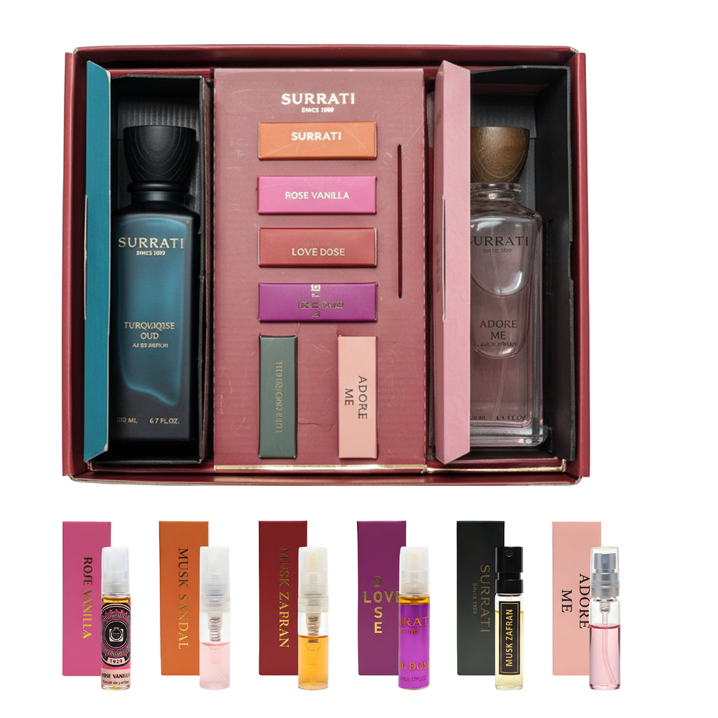 Sample Vials Included: The set also contains several small sample bottles for trying other luxurious aromas, such as Rose Vanilla, Musk Sandal, Musk Zafran, Love Rose, and Mehyar.