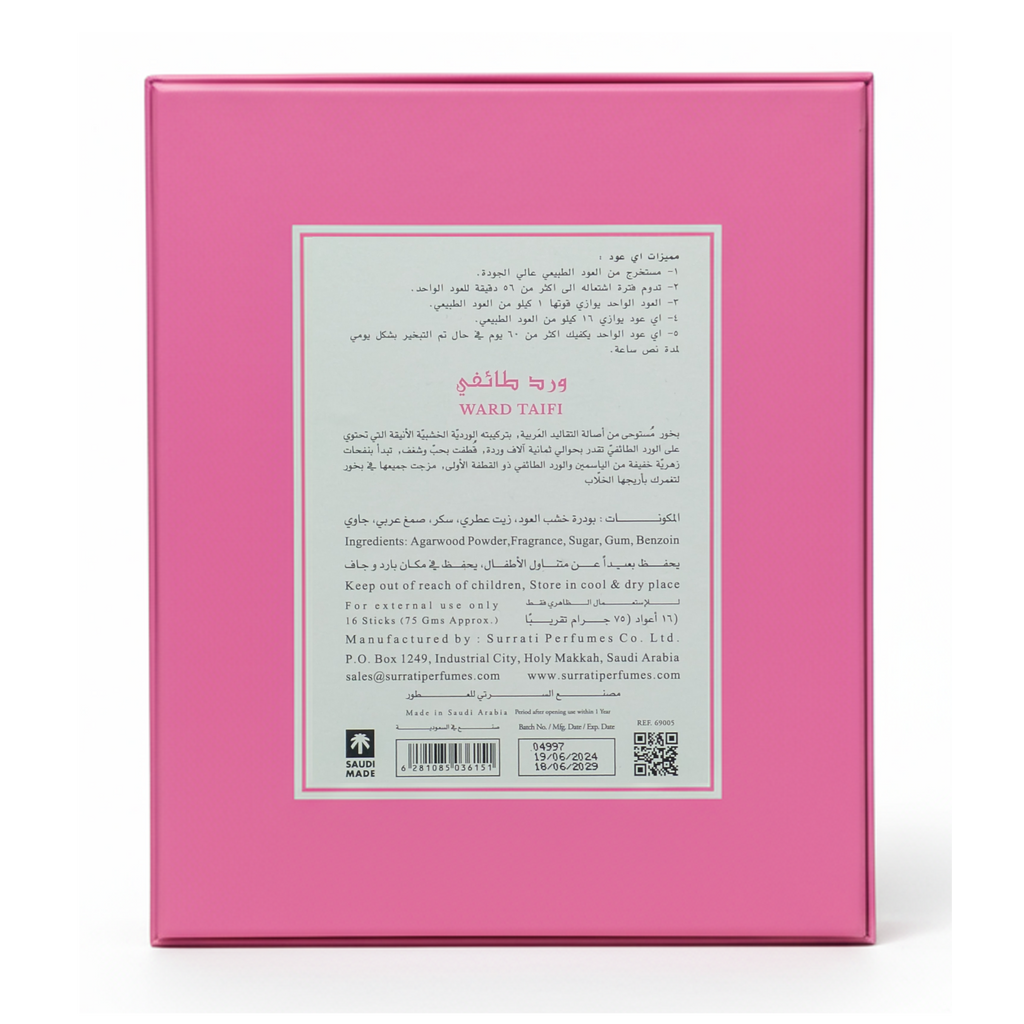 Introducing Our Ward Taifi Oud Sticks, a luxurious collection of 16 premium sticks crafted from high-quality natural oud wood. This exquisite incense is uniquely infused with the distinct floral notes of Taif rose and jasmine. Ward Taifi delivers an elegant, long-lasting fragrance, creating a soothing and luxurious atmosphere perfect for meditation, relaxation, or special gatherings.